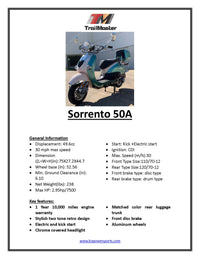 Electric Start with a kick start back up, turn signals, flashers, hi/low beam, emergency lights, everything right at your fingertips! Free 6 Month Factory Parts Warranty! The Sorrento is a quality scooter that is unmatched in the industry. With its smooth, quiet 4-stroke 49.5cc engine, CVT automatic transmission, front, and rear disc brake, low seat height and 50 inch wheelbase the Sorrento has universal rider appeal. This is a popular and nimble full-size scooter with something to please just about everybody.