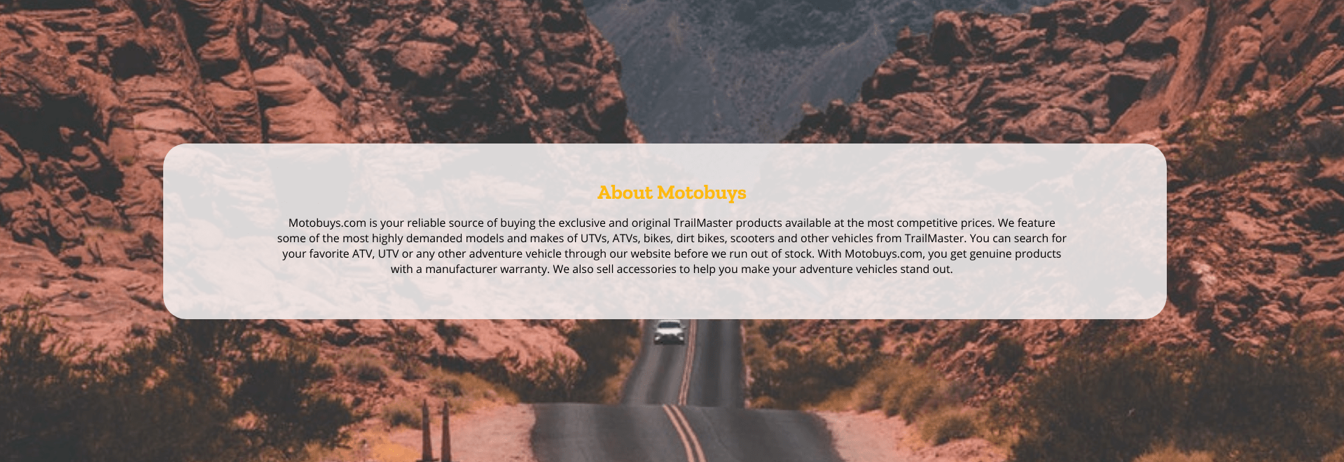 You can search for your favorite ATV, UTV, or any other adventure vehicle through our website before we run out of stock. With Motobuys.com, you get genuine products with a manufacturer warranty. We also sell accessories to help you make your adventure vehicles stand out.