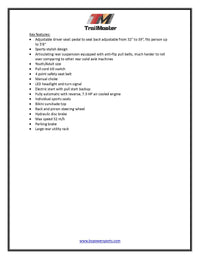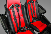 • Safety is built into this unit, low center of gravity, full roll cage, grab handles, full seat belt set up, an adjustable driver's seat, adjustable speed limiter.