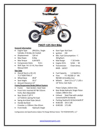 This is a complete line of dirt bikes for the whole family. The 110cc TM 10, the TM 11, and the 125cc TM 27 and TM 29, and the 300cc TM 31, TM31X, TM 36, TM 38 feature top-quality workmanship. From the 10" to 21" front rims, to the thought put into the design, these bikes are clearly the top choice for 2022.