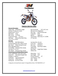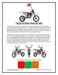 This is a complete line of dirt bikes for the whole family. The 110cc TM 10, the TM 11, and the 125cc TM 27 and TM 29, and the 300cc TM 31, TM31X, TM 36, TM 38 feature top-quality workmanship. From the 10" to 21" front rims, to the thought put into the design, these bikes are clearly the top choice for 2022.