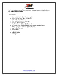 The Trailmaster TM-31X PRO 250 has LED Headlight, Tail Lights, Turn Signals, Side View Mirrors, 5 Speed Manual Trans, and a Digital Dashboard.