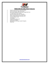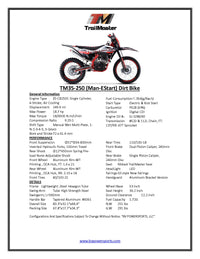 The all-new TM35 250cc Dirt bike is the newest exciting off-road product from one of the industry's largest and most innovative companies. This all-new 250cc full-size dirt bike is the most powerful bike in the class. The larger frame and the taller seat make this a perfect fit for the big guys in the house.